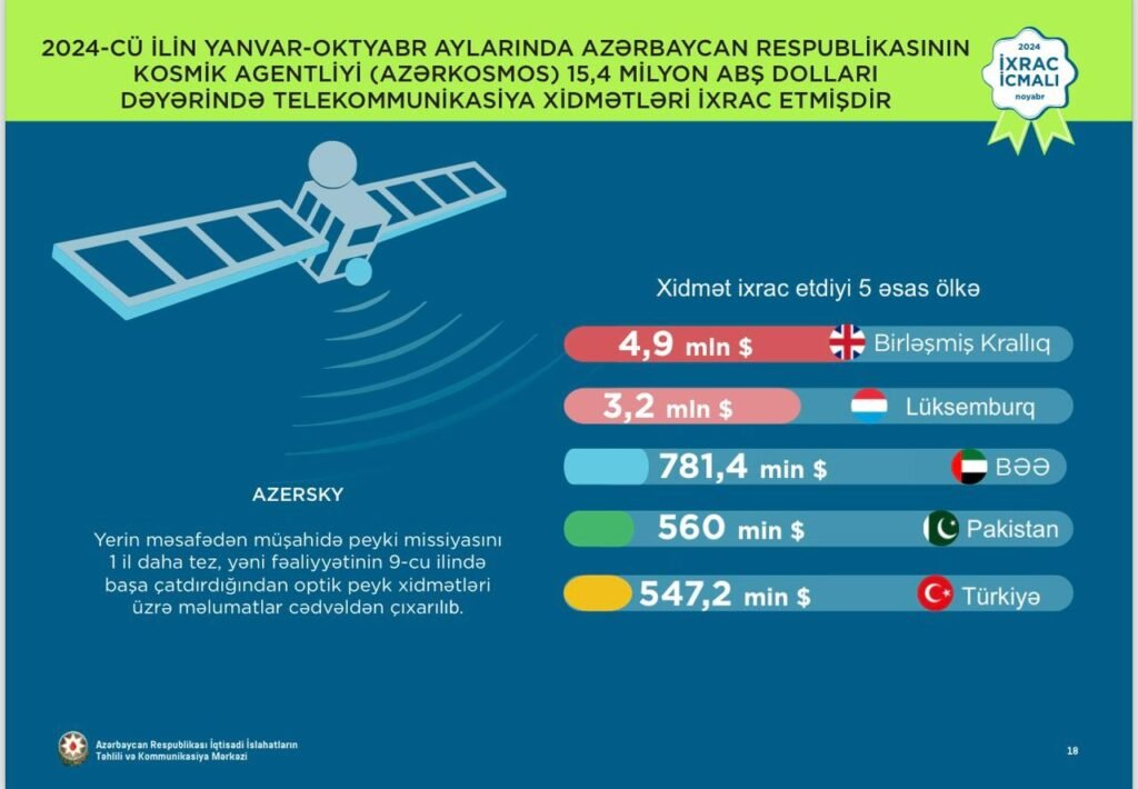 Oktyabr göstəriciləri: 2024-cü ilin oktyabr ayında isə “Azərkosmos” 40 ölkəyə 1,6 milyon ABŞ dolları dəyərində peyk telekommunikasiya xidməti ixrac edib.